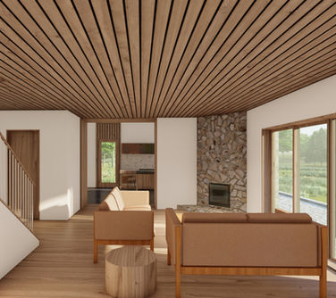 The design takes cues from local barn structures and incorporates a silo-like 3-story tower offering views of a new 5-acre pond and its wildlife. Clad in local stone and reclaimed wood, the materiality references its surroundings, including a "ruin garden" landscaping feature created from the fieldstone foundation of a former farmhouse. The goal of the design is to optimize natural light and views while maintaining an energy-efficient envelope. In addition to triple-pane windows, the walls and roof will be wrapped with an additional continuous layer of rigid insulation outside of the structure.